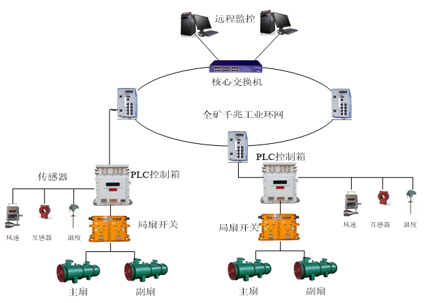 我公司研發的局部通風機智能控制系統實現了用地面監控計算機對井下局部通風機的啟??刂疲幻刻於〞r自動對主備風機進行切換實驗;能夠在主風機因故障停車時自動切換至備用風機,并在主風機回復正常后停止備用風機恢復主風機的工作;能夠對風機運行狀態、瓦斯濃度、風速進行監測;地面監控軟件能夠記錄局扇風機運行和試驗的歷史資料;能夠將全礦局扇的運行信息通過局域網傳送給有權瀏覽的用戶。